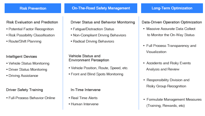 JIMU active safety solution for commercial fleets could help improve driving safety via three steps: risk prevention,active safety management on the road, and long-term operation optimization.